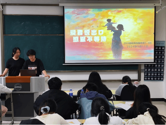 “同學(xué)們,猜一猜明天是什么節(jié)日啊?”“母親節(jié)!”5月11日,新聞傳播學(xué)類專業(yè)2023(7)、(8)班在K202教室開展以“愛要說出口,感恩不等待”為主題的團(tuán)建活動(dòng)?;顒?dòng)開始前,活動(dòng)負(fù)責(zé)人、新聞傳播學(xué)類專業(yè)2023(7)、(8)班的班長楊雨霏、朱研溪提前為每位同學(xué)準(zhǔn)備好信紙和信封。朱研溪說:“我們希望通過寫信這種傳統(tǒng)而深情的溝通方式,讓同學(xué)們勇敢表達(dá)自己的心聲,將對母親的愛訴說于筆尖?!睂W(xué)生們觀看一段關(guān)于母愛的感人短片后,...